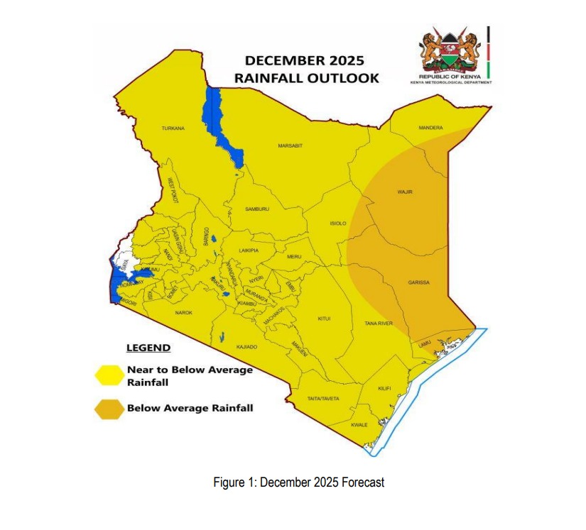 The Kenya Meteorological Department in the forecast indicates that, the northern half of the country is likely to receive occasional rainfall at the beginning of December, followed by generally dry conditions for the remainder of December, January, and February.