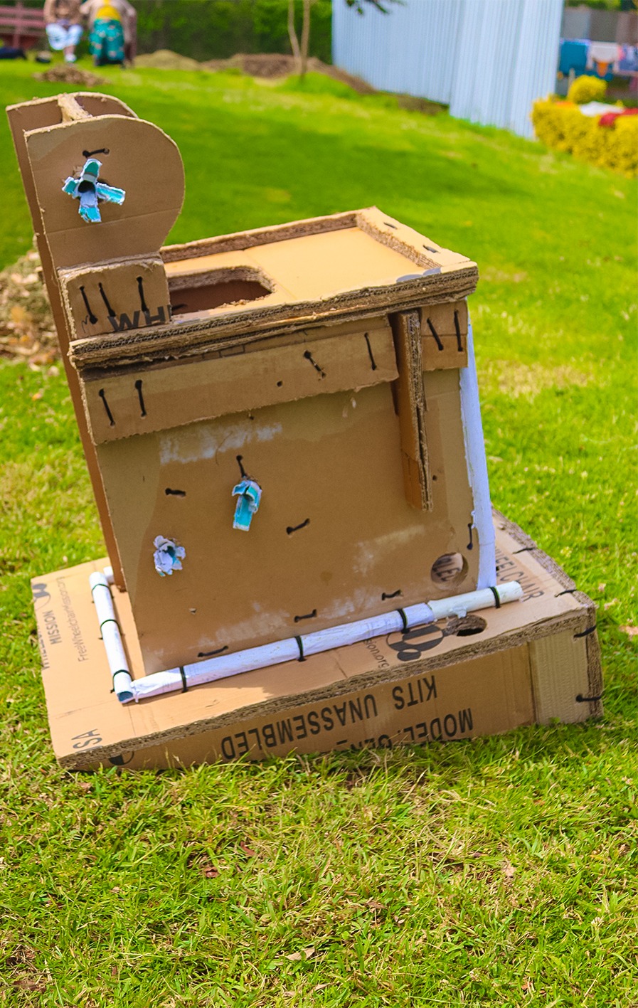 The method involves layering recycled cardboard and paper to create strong, customized seating and standing aids designed to support children with special needs experiencing developmental delays to gain better posture and development.