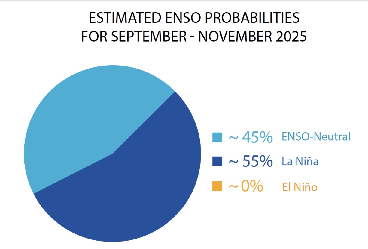 According to the latest forecasts from the WMO Global Producing Centres for Seasonal Prediction, there is a 55 percent chance for sea surface temperatures in the equatorial Pacific to cool to La Niña levels, and a 45 percent chance for them to remain at ENSO-neutral levels during the upcoming September–November 2025 period.